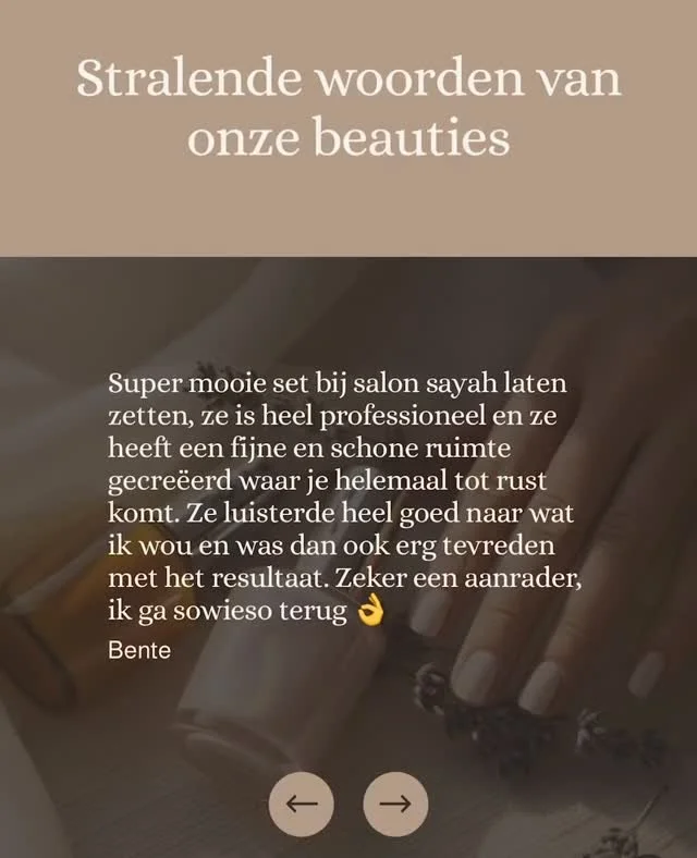 Bij Salon Sayah draait het om meer dan alleen beauty – het is een ervaring. Of je nu kiest voor een subtiele nude manicure, een opvallend nail art design of een natuurlijke wimperlook, alles wordt met zorg, stijl en perfectie uitgevoerd.